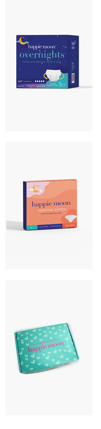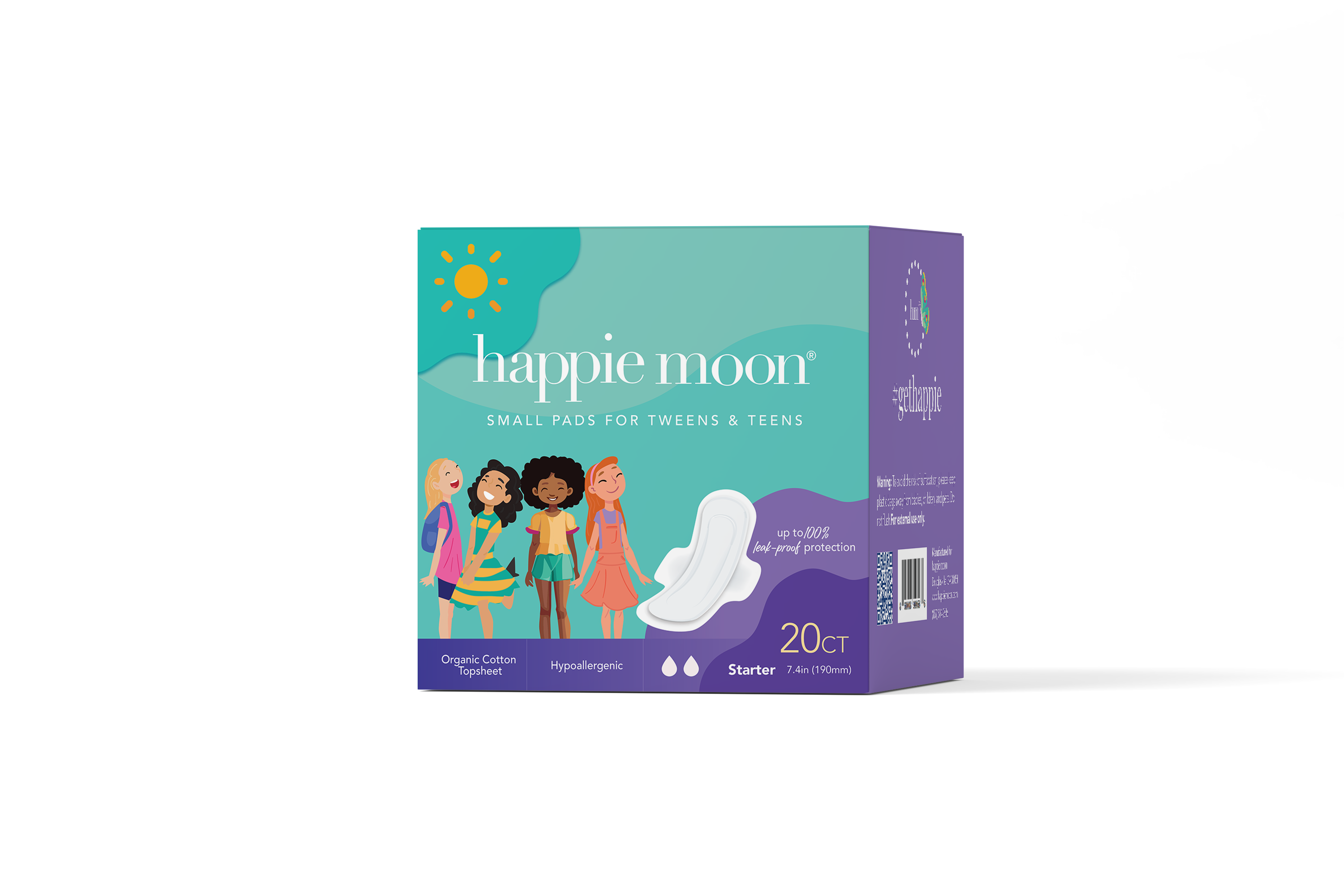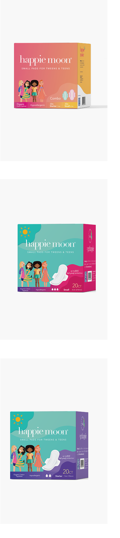 happie moon® is a health and wellness company dedicated to revolutionizing fem-care for the next generation. As a tween, starting your period can be a big adjustment, and traditional period care products often fall short. At happie moon®, we believe that everyone deserves access to high-quality, safe, and thoughtfully designed period products that prioritize comfort and well- being. That’s why we’ve created some of the smallest pads available in the US, ensuring a perfect fit for growing bodies.
